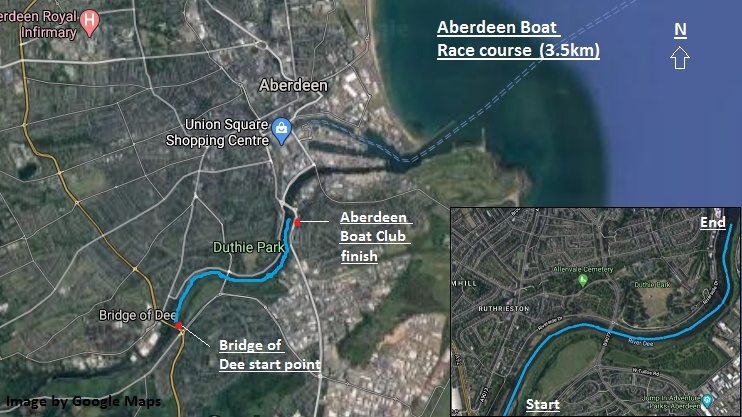 The race is contested from the Bridge of Dee to Aberdeen Boat house at a total distance of 3.5kms. One of the fastest times in recent results is 07 minutes 03 seconds posted by University of Aberdeen in 2017.