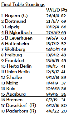 The final Champions League spot was also up for grabs between high-flying Borussia Monchengladbach and 2001/02 Hampden finalists Bayer Leverkusen. The Foals beat Leverkusen to fourth spot and a coveted position in Europe’s premier competition beating Hertha Berlin 2-1.