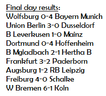 The rest of the day’s action saw Borussia Munchengladbach beat Bayer Leverkusen to the coveted final Champions League spot. Borussia Dortmund were hammered 4-0 at home to Hoffenheim securing the Seinsheimers automatic entry into next season’s Uefa Cup. Timo Werner scored a brace in his final game for RB Leipzig before moving to the English Premier League, and Bayern put four past Wolfsburg taking their tally to 100 goals scored in a single campaign.