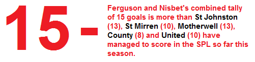 Aberdeen midfielder Lewis Ferguson is top of the SPL goalscoring chart with eight in eleven whilst Hibs striker Nisbet is second with seven in ten.