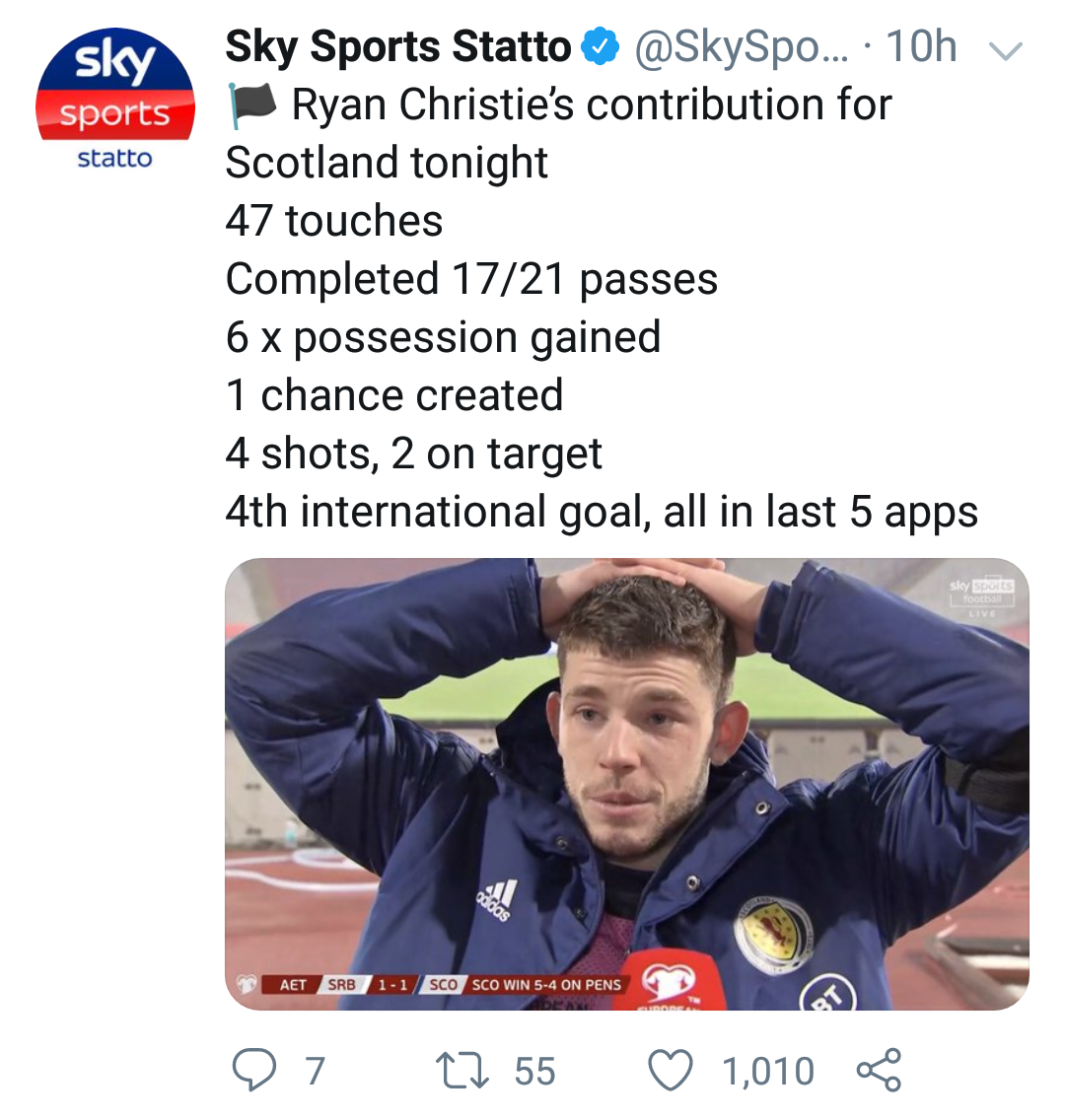 McGinn and McGregor had shouts for MOTM with the work-rate they put in the middle of the park but the Celtic forward just pipped it. Christie’s speed and agility up top caused Serbia problems and left them thinking all night long. His goal was superbly taken.