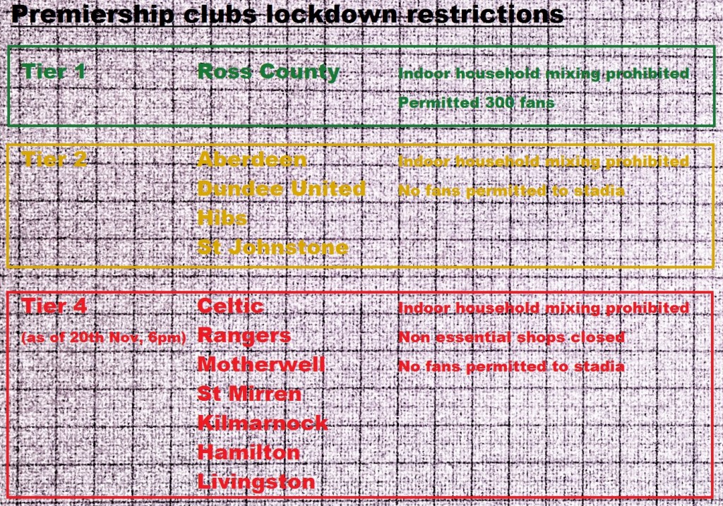 Celtic, Rangers, Kilmarnock, Motherwell, Hamilton, Livingston and St Mirren are all in areas now under the tightest of controls.