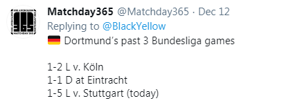 Four defeats in eleven – three of them coming at home – and two losses and a draw in the last three games leave Dortmund fifth in the table, six points behind first place Bayer Leverkusen.