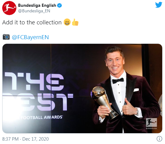 Congratulations the BEST Men’s Player of 2020. Robert Lewandowski is a GREAT player and it is always with huge interest and joy we watch him playing. Yes Robert, you deserve the Trophy.