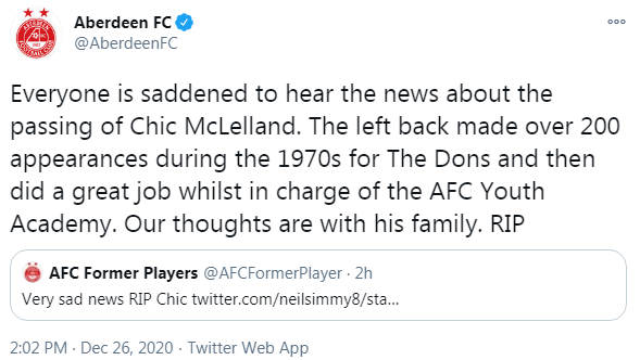 Willie Miller paid tribute to McLelland before Aberdeen’s Boxing Day game against St Johnstone, telling BBC Sport: “He was a very prominent player in the 70s. Influential on the development side as well and very sad to hear of his passing.”