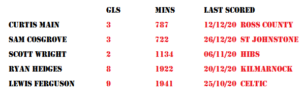 Of their main source of goals – Ferguson, Cosgrove, Main, Wright and Hedges – the last to score was Cosgrove in the 2-1 win over St Johnstone at the end of 2020.
