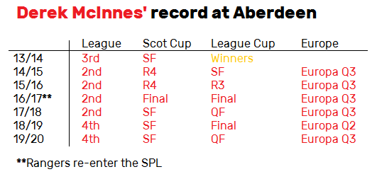 It’s a difficult one assessing McInnes, taking into account Aberdeen’s realistic target to finish third – which they are hitting. The manager’s record in the Granite City, on paper, is relatively strong, including six straight Europa League finishes.