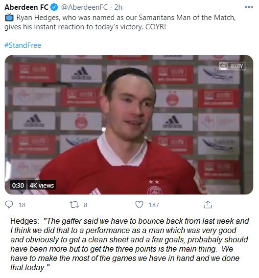 The win is Aberdeen’s first of 2021 and sees the Dons go into third a point ahead of Hibs with a game in hand and four points behind second placed Celtic.