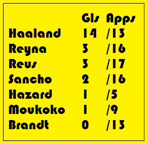 No one can complain about Haaland’s effort, the Norwegian having scored 14 goals in 13 league games, but Sancho, Reyna, Brandt and Reus have not backed up their colleague with eight goals scored between them – average of two each in the season so far.