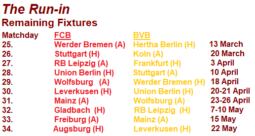 Bayern Munich withstood in a classic on Saturday evening beating old rivals Borussia Dotrmund 4-2. With Bayern having regained top spot after momentarily losing it to RB Leipzig, and Dortmund suffering their ninth defeat of the season to leave the BlackYellows languishing in sixth, what does the remaining fixtures suggest for how both club’s respective seasons will pan out?